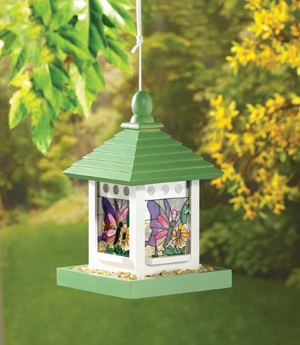 Butterfly Gazebo Birdfeeder, Bright spring green and crisp white combine to form a fetching frame for four glowing panels of colored stained glass, each depicting a butterfly gently nuzzling the morning’s first tender blooms. Holds a generous helping of birdseed to nourish hungry visitors. Adds a splash of beauty and color to any garden! Wood. 6" diameter x 9" high.