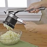 OXO , This 3-in-1 adjustable potato ricer is a kitchen essential to create smooth, lump-free mashed potatoes, sauces, soups, puree food, and press water from vegetables. Rotating discs with three settings change puree consistency without changing discs. Fine setting is perfect for fluffy mashed potatoes, carrots or gnocchi. Medium is ideal to create spaetzle or press water from cooked greens or vegetables. Coarse setting is great for applesauce, jam or thicker sauces. With the easy-press plunger, this potato ricer is also a food strainer to prepare foods for canning, easily separating skins and fibers from juice. Rices fruits or vegetables to prepare healthy, preservative-free baby food. Rests securely over a bowl or pot using the grooved pot rest. Santoprene cushioned handles are comfortable to hold and press, absorbing downward pressure to prevent hand fatigue. Removable stainless-steel discs are heat- and stain-resistant to process hot or acidic food. BPA-free hopper and pusher. Top-rack dishwasher-safe.